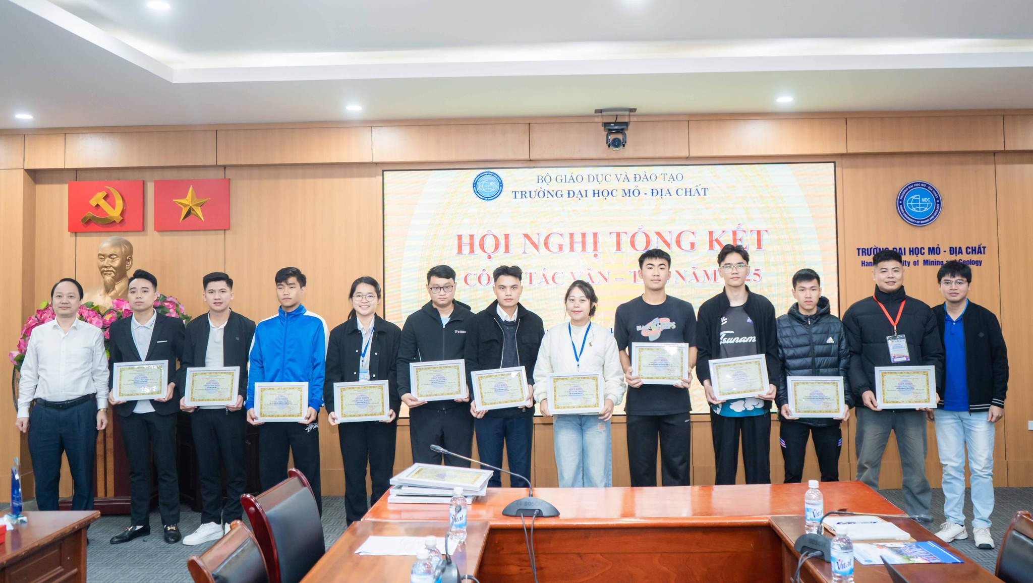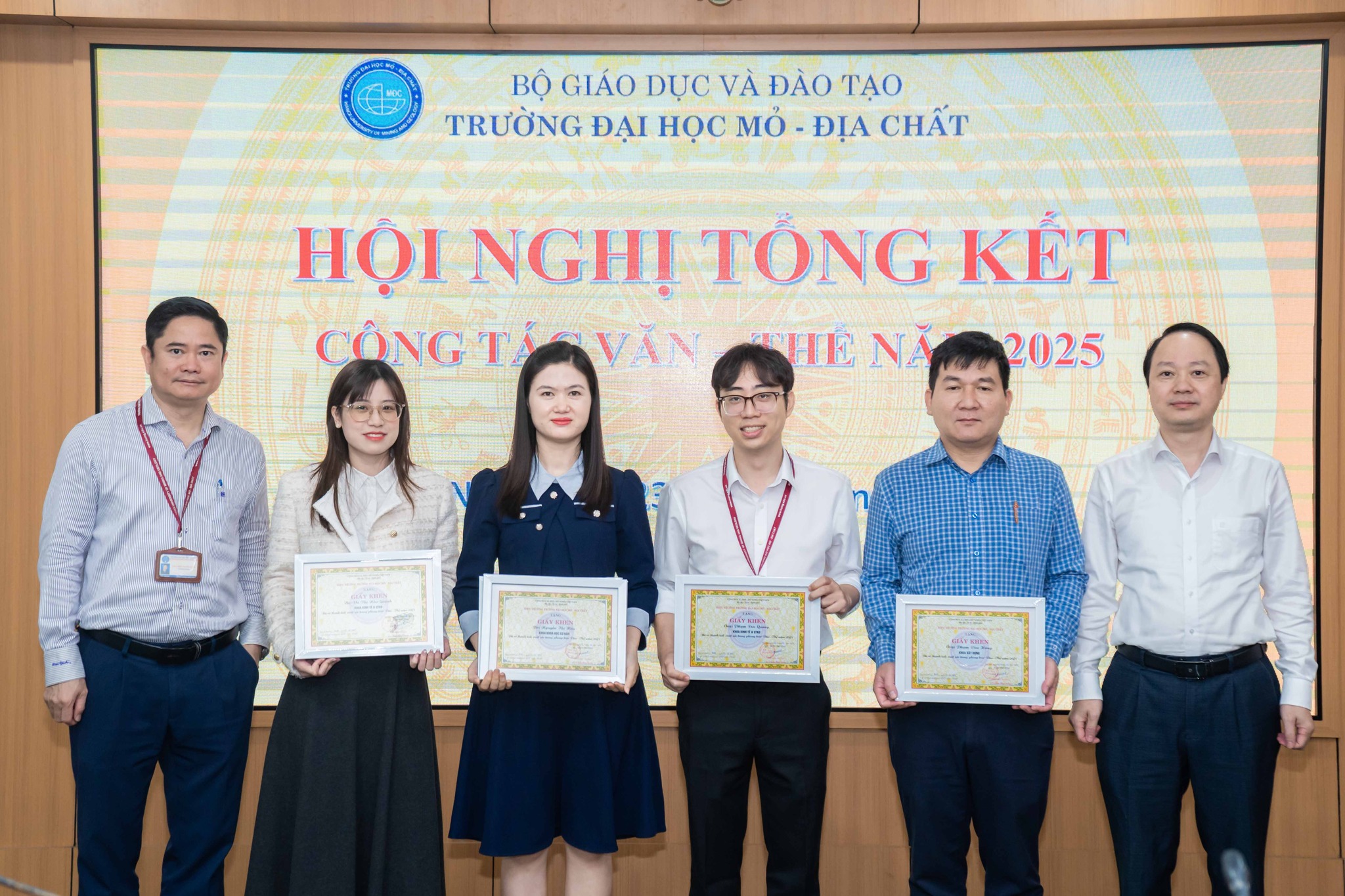 Nhân dịp này, Nhà trường đã trao khen thưởng cho các tập thể và cá nhân cán bộ, sinh viên có thành tích xuất sắc trong phong trào văn hóa – văn nghệ – thể thao năm 2025, ghi nhận những đóng góp tích cực vào việc xây dựng môi trường giáo dục toàn diện của Trường Đại học Mỏ – Địa chất.