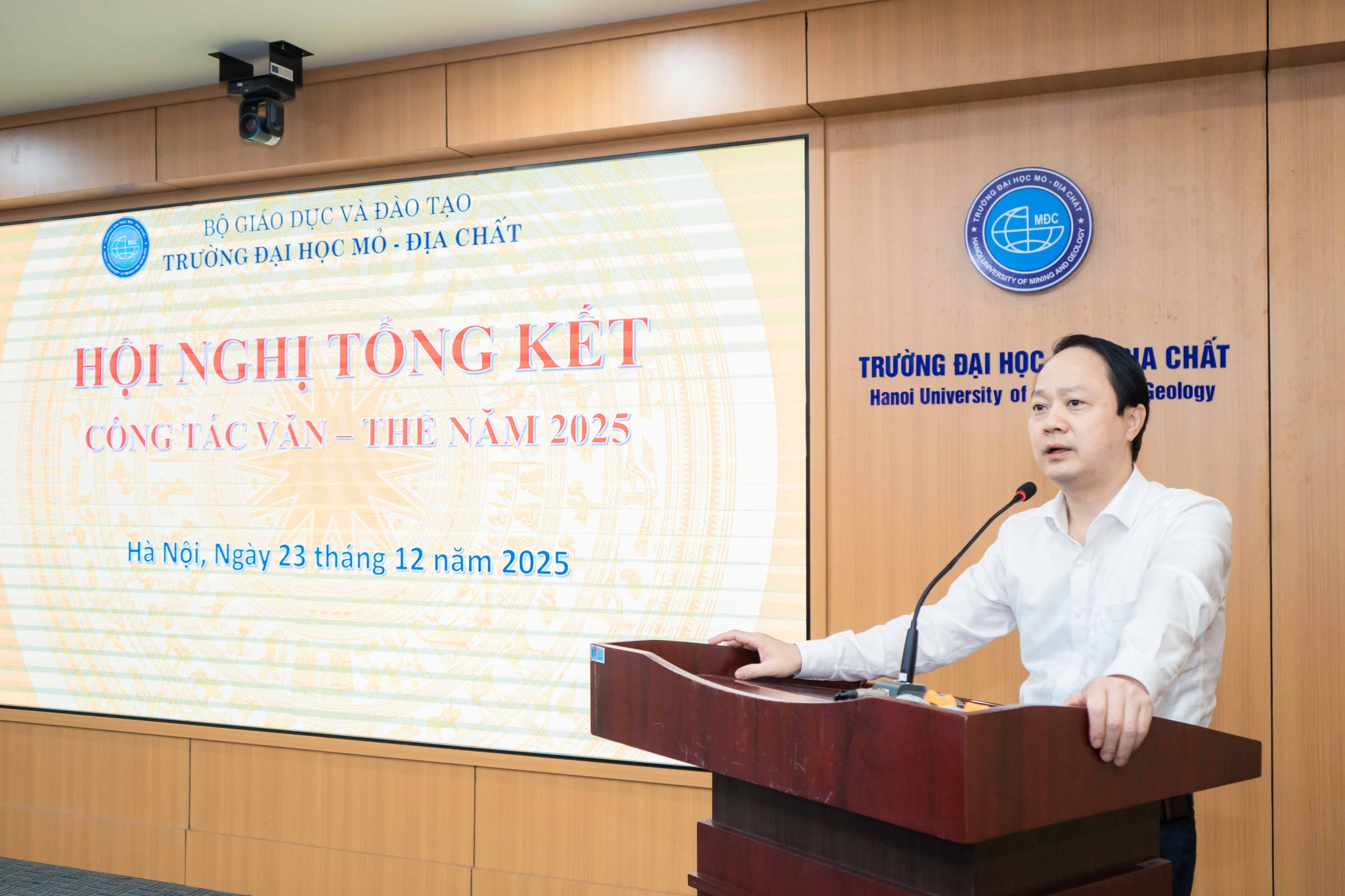 Tại hội nghị, TS Bùi Mạnh Tùng – Phó Trưởng phòng Công tác Chính trị – Sinh viên đã trình bày Báo cáo tổng kết hoạt động văn hóa – văn nghệ – thể thao năm 2025 của Nhà trường. Báo cáo cho thấy, phong trào văn thể của HUMG tiếp tục được duy trì và diễn ra sôi nổi, thu hút sự tham gia tích cực của cán bộ, giảng viên và sinh viên.